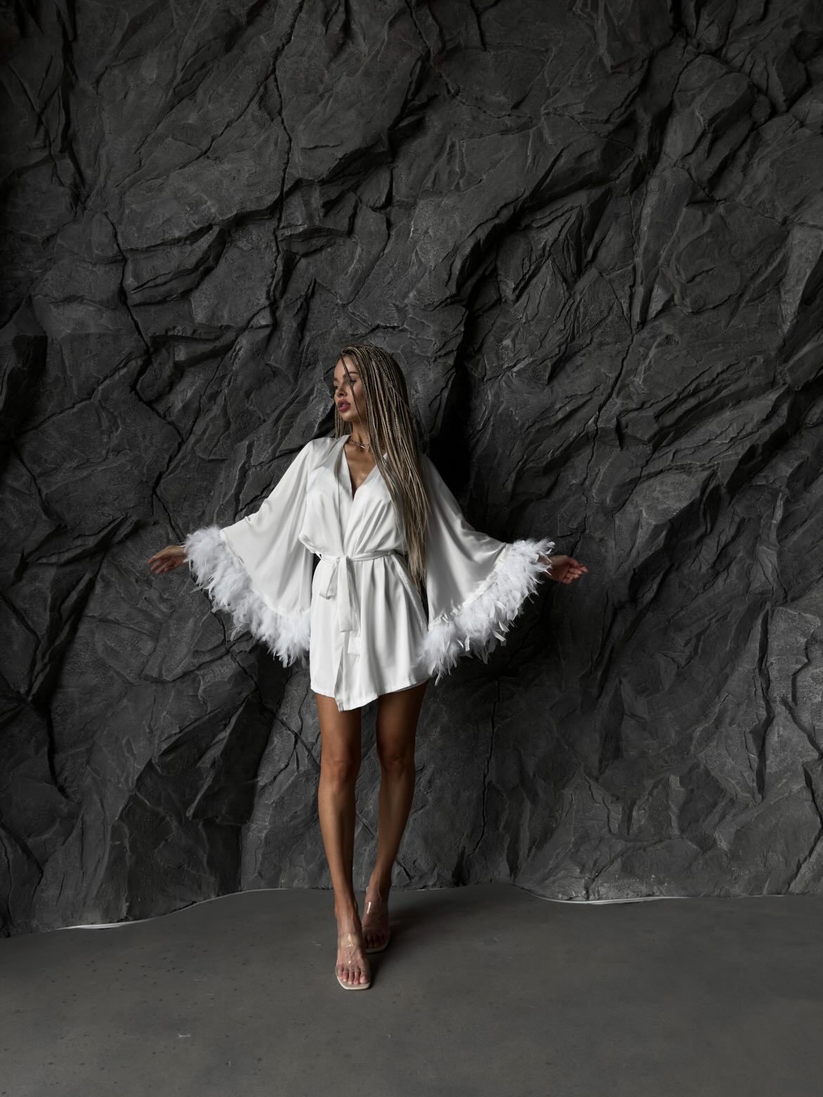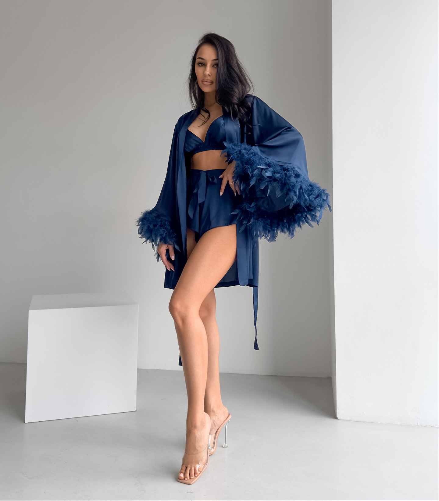 Feather Trim Underwear Shorts Robe Home Three-piece Set