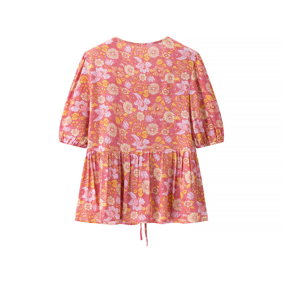 Women's New Fashion Viscose Wrinkle Print Short Sleeve Embroidered Shirt